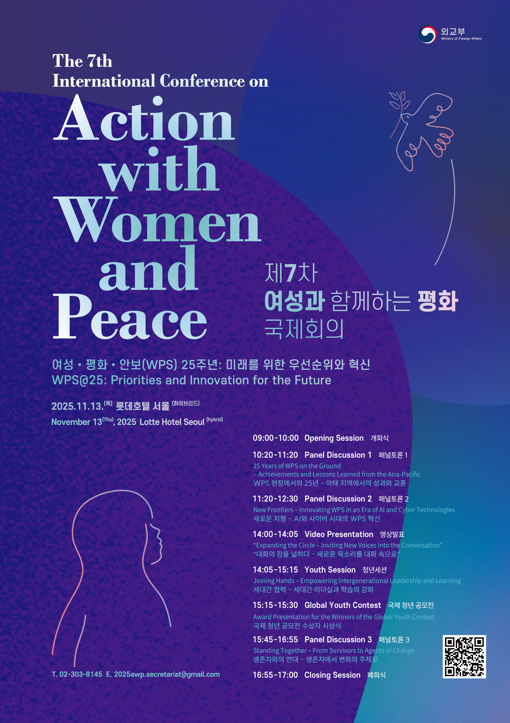 외교부는 오는 11월 13일(목) 롯데호텔 서울에서 제7차 「여성과 함께하는 평화」 국제회의를 개최한다. 이번 국제회의는 유엔 여성ㆍ평화ㆍ안보(Women, Peace and Security, WPS) 의제 논의 25주년을 맞아 WPS 의제의 “미래를 위한 우선순위와 혁신”이라는 주제로 개최된다.